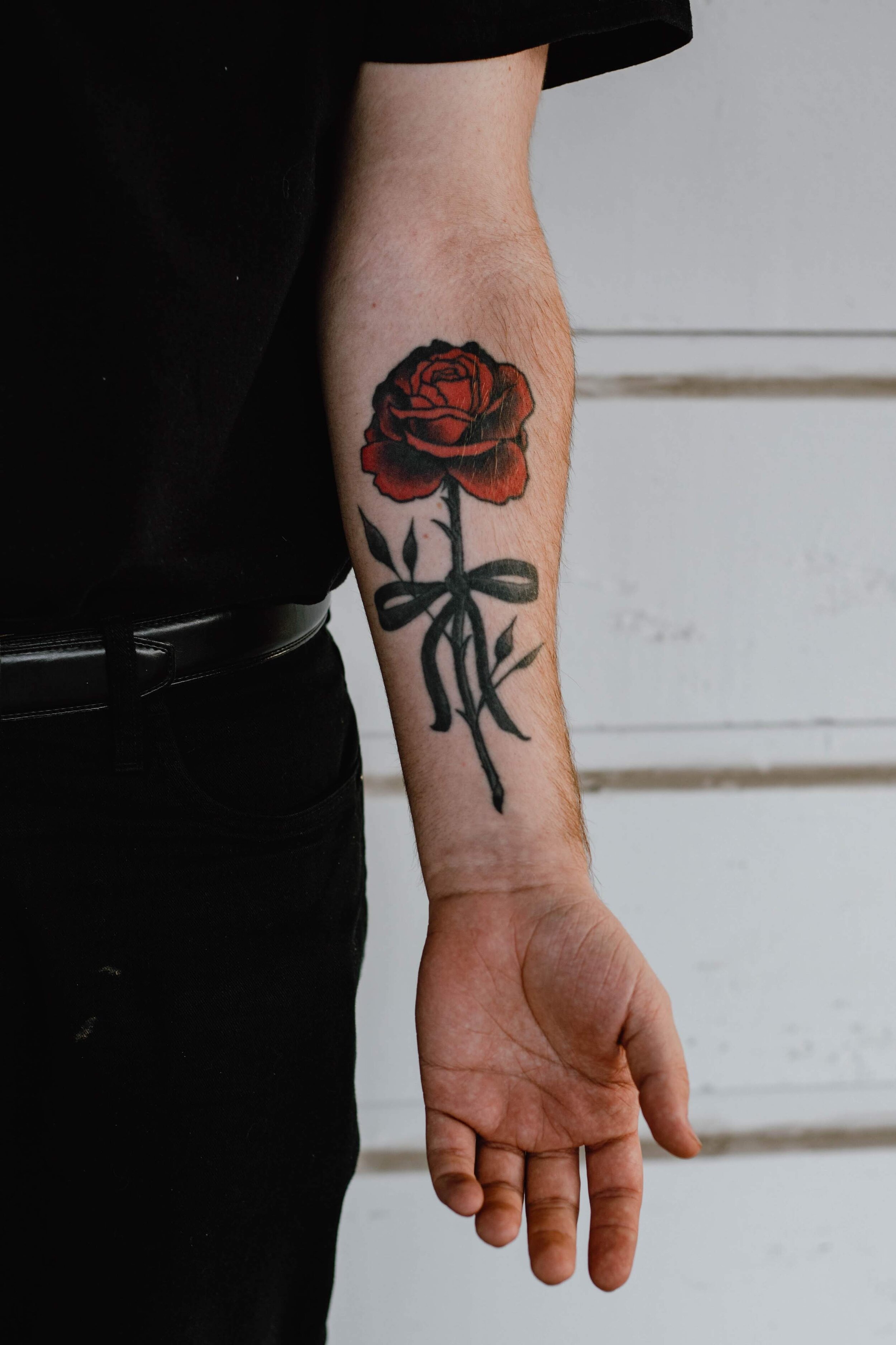 “The rose on my arm is from the musical The Phantom of the Opera, in the musical (and more specifically the movie adaptation) the rose with a black ribbon is what the phantom uses as a memento for his love interest. It’s how she knows it’s from him specially. It’s a way he expresses his love for her without saying anything. So I got it because I thought the imagery was not only beautiful but fitting as a tattoo. I could express my love for something without saying anything at all.