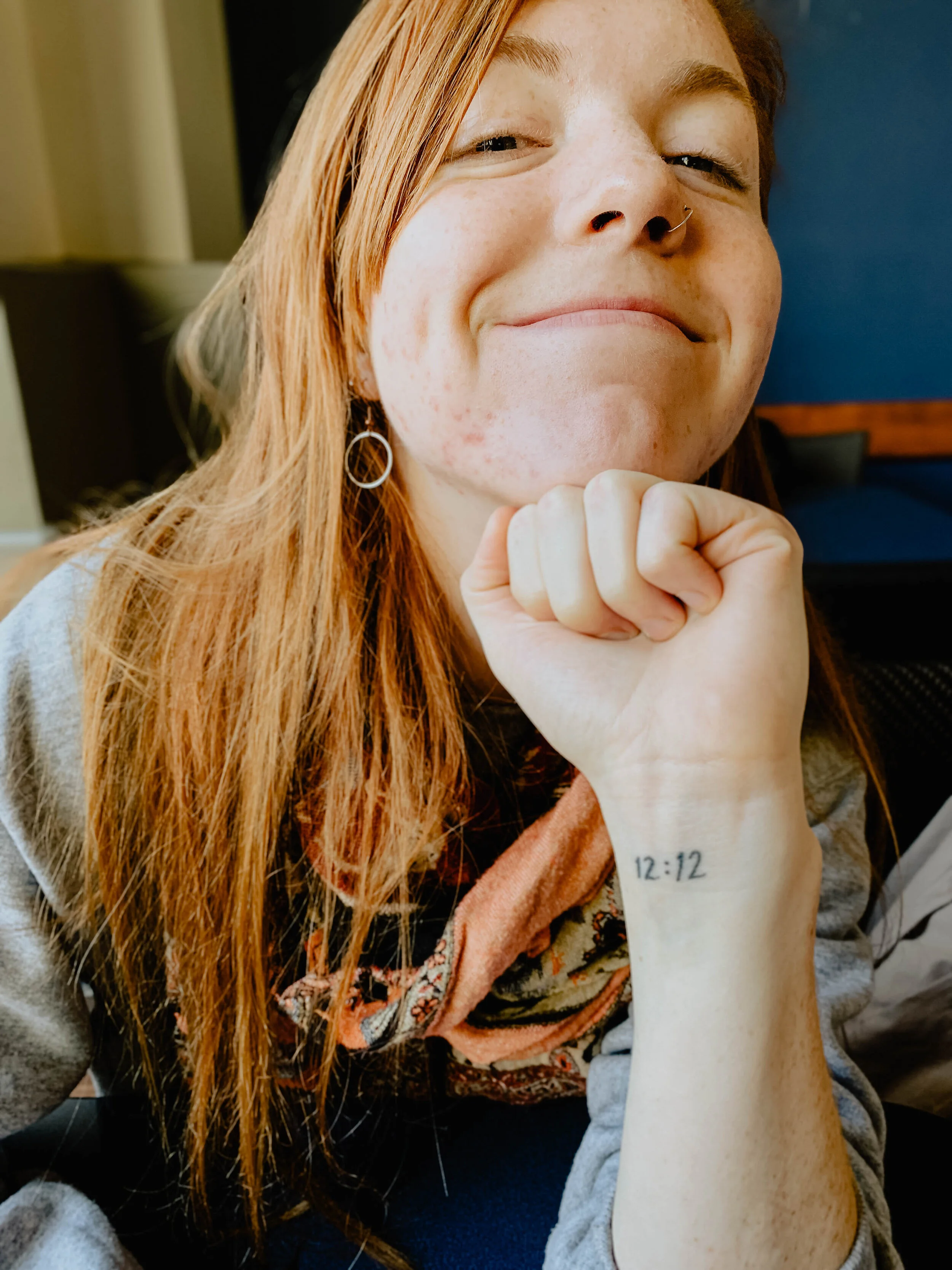 “So the 12:12 stands for Romans 12:12, which says “Rejoice in hope, be patient in tribulation, be constant in prayer.” I used to live overseas and things were a bit crazy, so I tried to keep it written on my wrist as a daily reminder. Because God really is constant and true. I made a bet with my dad that I wouldn’t get a tattoo, so I wrote it on my wrist almost every for 4 years. But then last Christmas he surprised me and took me to get it tattooed. What makes it special is that it’s in my handwriting. And since I wrote it on there for so long, it immediately felt normal to have there almost every day.” - Shiloh Fox